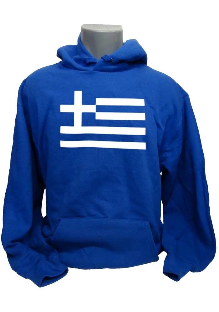 Kapuzenpullover (280 g / m², 80% Baumwolle, 20% Polyester) in blau mit Griechenland Fahne bedruckt.