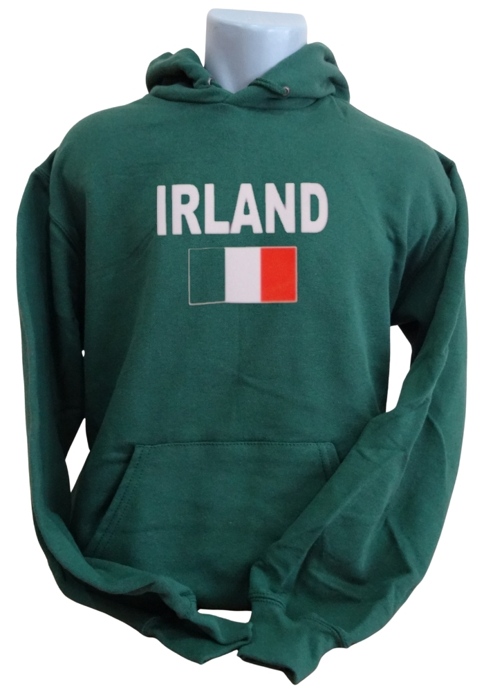 Kapuzenpullover (280 g / m², 80% Baumwolle, 20% Polyester) in flaschengrün mit Irland Schriftzug und Irland Fahne bedruckt.