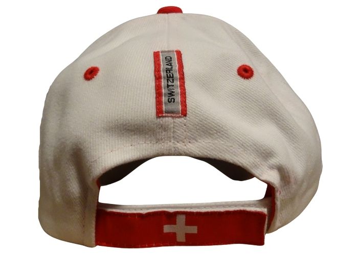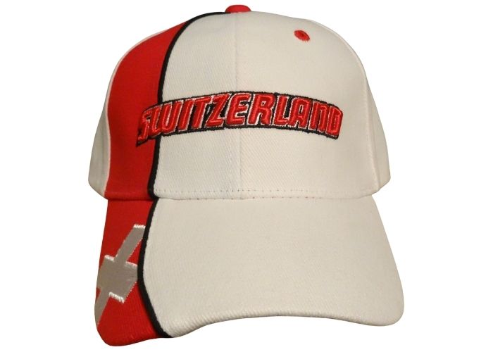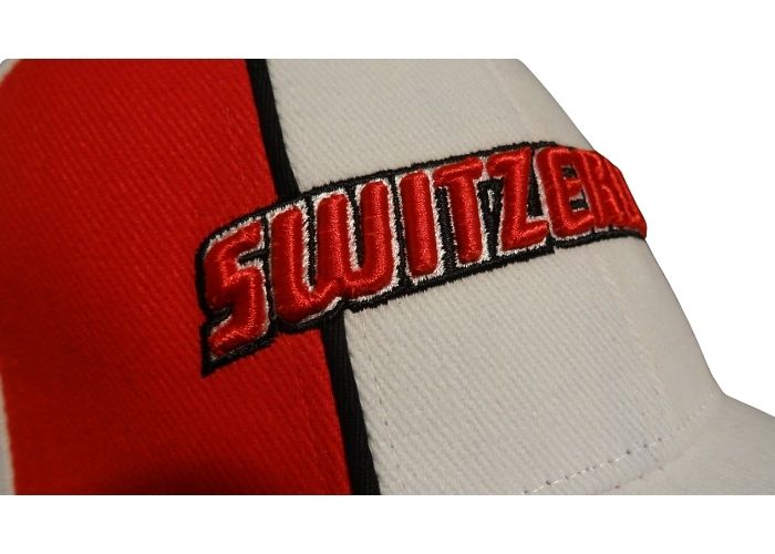 9 Panel Cap mit Schweiz Fahne und Switzerland Schriftzug, 100 % Baumwolle. Aufwändig gearbeitete Frontpanels mit Flaggen- und 3D-Stickerei, 5 kontrastfarbigen Luftlöchern und bedruckten Innenbändern sowie verstellbarem Klettverschluss mit Landesfahne.