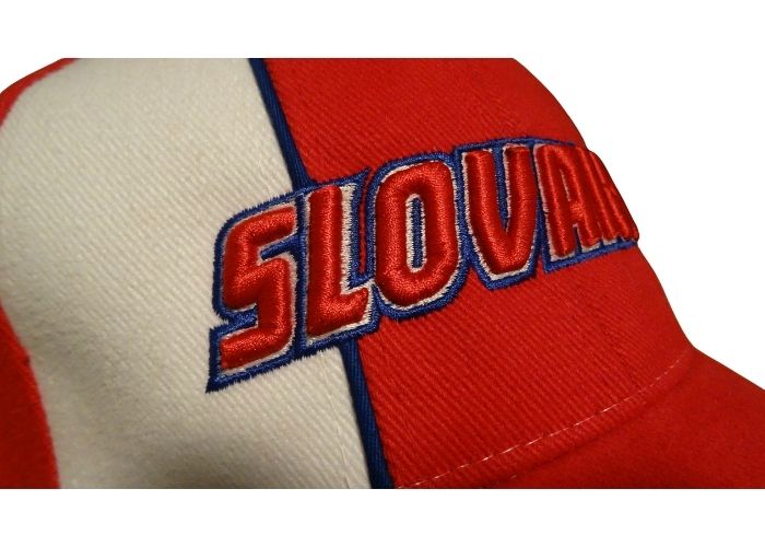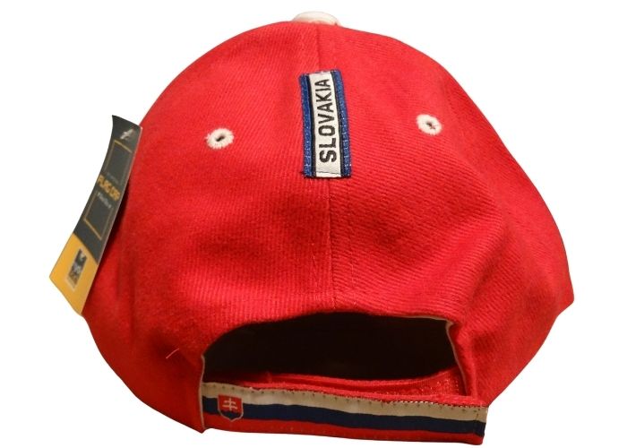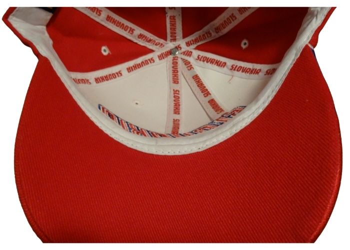 9 Panel Cap mit Slowakei Fahne und Slovakia Schriftzug, 100 % Baumwolle. Aufwändig gearbeitete Frontpanels mit Flaggen- und 3D-Stickerei, 5 kontrastfarbigen Luftlöchern und bedruckten Innenbändern sowie verstellbarem Klettverschluss mit Landesfahne.